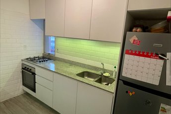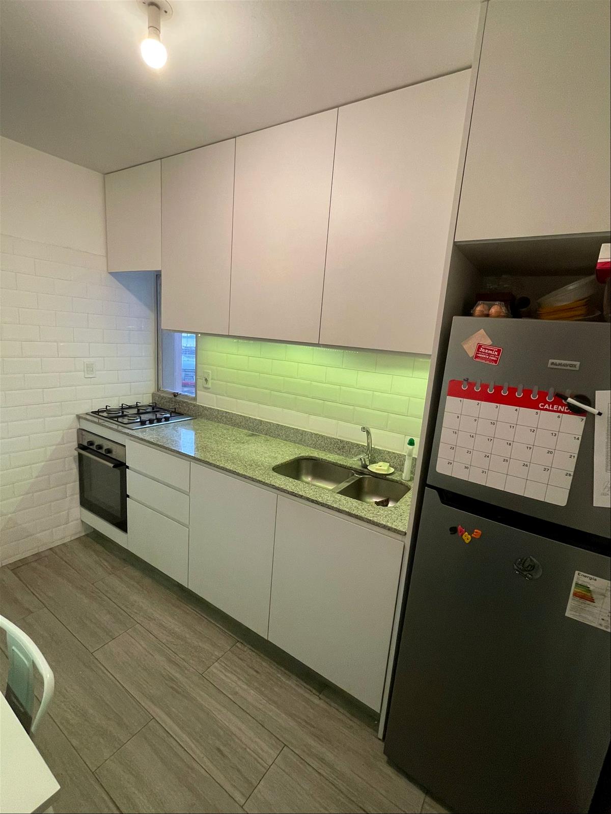 Cocina con placares aéreos y bajo mesada, horno y anafe.